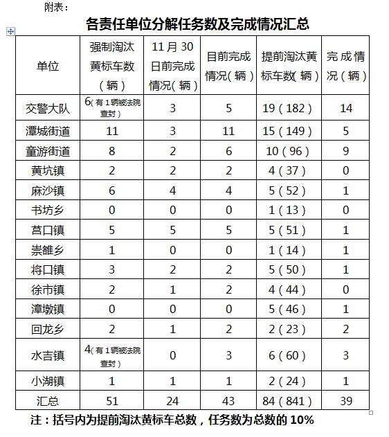 本報訊 根據《南平市人民政府辦公室關于貫徹落實省政府切實做好黃標車淘汰工作的意見》要求,2015年全部淘汰2005年底前注冊營運的黃標車,是今年國務院《政府報告》提出的硬性任務,也是《福建省大氣污染防治行動計劃實施細則》的明確要求,必須堅定不移地完成。 今年省政府及南平市政府下達我區黃標車淘汰任務是:2015年11月30日前全面完成51輛營運黃標車淘汰報廢任務,2015年12月30日前全面完成84輛黃標車提前淘汰報廢任務。 目前我區已按照南平要求建立了黃標車淘汰工作聯席會議制度,并制定了黃標車淘汰工作實施方案,明確了工作要求和保障措施。同時多次召集環保、交警大隊、交通運輸局、財政局、商務局、統計局、效能辦、區委宣傳部等相關部門召開黃標車淘汰工作推進會,并具體細化各部門工作職責,確定在原有黃標車淘汰工作聯席會議制度的框架下,將全區黃標車淘汰工作任務分解到各個鄉(鎮)、街道,及各相關職能部門,并下達了《南平市建陽區人民政府2015年度黃標車淘汰工作目標責任書》,明確在各鄉鎮(街道)、區直部門創業競賽、績效考評基礎上新增倒扣分,由效能辦、統計局跟蹤督察。 據了解,根據《南平市鼓勵黃標車提前淘汰報廢獎勵辦法(2015-2016)的通知》,我區暫按照南平市要求標準執行黃標車提前淘汰報廢獎勵辦法。確定在區行政服務中心設立黃標車淘汰受理窗口,由區商務局、交警大隊、環保局派人負責日常工作。 截止12月18日,全區總完成淘汰數為82輛(其中營運類43輛,提前淘汰39輛),營運類還有8輛(包括法院查封的2輛)未完成,提前淘汰有45輛未完成。詳見下表(附表)。 黃標車淘汰完成車牌號: H67325 HY8328 HY8305 HY8323 HY8293 HY8264 HY8089 HY8091 HY8518 HF0775 H89805 H80994 HL3211 HQ2877 H85506 H88660 H83597 H81101 H81970 H58812 H82877 H83136 HG2987 HY8312 HY8345 HL3507 HW6061 H81479 HR9701 HG6558 HAN809 H89156 H89231 H83579 H80860 HQ2199 H21995 H2856B HL3070 2005年底前注冊營運的黃標車淘汰完成車牌號: H65798 HD2275 H89172 H81146 H81091 H82779 H88787 H82750 H81166 H88306 H13092 H80989 H81368 H82289 H81601 H88038 H83515 H83526 H83208 H88081 H81381 H83287 H53317 H85796 H08731 H89577 H79728 H81537 H88303 H82867 H87550 H81836 H83316 H41895 H81165 H81852 H80899 H52281 H52272 H88089 H89267 H81512 H82665 最后5輛還未淘汰的強制淘汰營運類黃標車名單車牌號: H81209 H81925 HC9870 H81621 H81497 |