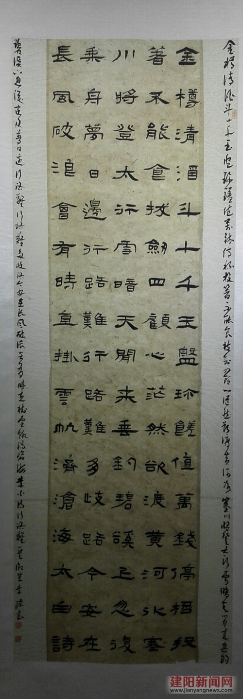 ??? 本報訊第三屆全國教師現(xiàn)場書畫創(chuàng)評暨教學論壇,于5月17日至20日在江蘇蘇州舉行。來自全國20多個省市,200多名教師參加了現(xiàn)場大賽。我區(qū)曼山小學教師李瑋一路過關(guān)斬將,最終獲得現(xiàn)場創(chuàng)評一等獎。 本屆大賽是由《中國書法報》報社主辦、《書法報o書畫教育》編輯部、蘇州市鑒藏家協(xié)會承辦。大賽分為初賽和現(xiàn)場大賽兩個環(huán)節(jié)。評委會以質(zhì)量為原則,在全國各地教師投稿的兩千幅書畫作品中,篩選了兩百余幅優(yōu)秀作品,邀請優(yōu)秀作品作者參加現(xiàn)場創(chuàng)評大賽。在初賽階段中,李瑋老師的作品經(jīng)評委會評定,質(zhì)量很高,取得參與現(xiàn)場創(chuàng)評的資格。5月18日,在現(xiàn)場創(chuàng)評大賽中,李瑋老師創(chuàng)作的書法作品被評為一等獎。 李瑋老師熱衷于書法藝術(shù),幾十年如一日研習書法,其作品章法嚴謹,筆力遒勁,深受書法愛好者的喜愛。圖為李瑋初賽書法作品。 (張敏英) |