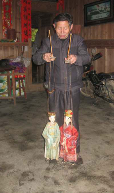 (鄧土旺演示提線木偶的操控) 木偶戲是由藝人操縱木偶表演故事的戲劇。木偶俗稱“傀儡”,木偶戲也稱“傀儡戲”,曾是偏僻山區群眾文化生活中唯一的亮點。上世紀90年代隨著電視的普及和人們精神生活的豐富,逐漸淡出人們的視野。然而,在閩北大山里的建陽區漳墩鎮碓后村這個畬族聚居地卻活躍著一支別具特色的提線木偶民間表演班。 表演班子由四人組成,都是漳墩本地農民,其中一人在后頭敲鑼打鼓,二人拉二胡、吹嗩吶,領頭的提線木偶藝人為漳墩鎮碓后村的鄧土旺老先生。老先生作為木偶操縱表演者,雙手可同時操縱4個偶人,一邊操縱一邊演說劇本。每年漳墩鎮當地及周邊的建甌、松溪、順昌、政和等縣市各處的廟會總是提前預約,請他們前去演出助興,成為閩北一支十分活躍的提線木偶演出班。 3月12日,筆者走進漳墩鎮碓后村財洋橋自然村鄧土旺老人的家。65歲的的鄧土旺老先生頭發花白、精神矍鑠,剛從建甌的小松鎮演出回來,正在房間為木偶道具做養護。床上、凳子上花花綠綠的木偶色彩艷麗,惟妙惟肖。老先生告訴我們,現在看木偶劇的人少了,但每次演出仍有不少老年觀眾捧場。現在最常表演的有《薛仁貴征東》等48個劇目,擔心表演劇本失傳,從上世紀八十年代初,鄧老先生開始手抄劇本,歷時16年,輯錄96本。老先生小心翼翼地捧起一個武官偶人告訴我們,這些木偶道具從雕刻成型到表情刻畫、服裝鞋帽的制作都由他親手完成。人偶道具共有48個,角色分為王侯將相、文臣武官、布衣鴻儒、士農工商等,收拾好剛好一挑,俗稱“傀儡擔”。 據了解,漳墩的提線木偶大概在清代時由南來北往的商人傳入。曾經是十里八鄉臨近縣市不多的娛樂形式之一,紅極一時。鄧土旺從小酷愛木偶劇,只要聽說有木偶表演,再遠也要趕去看上一場。他十三歲開始自學木偶劇演出必備的二胡、京胡、嗩吶等樂器的演奏技巧。27歲正式拜隔壁周家村的木偶藝人涂仁貴為師,學習木偶劇表演。由于天資聰穎,又刻苦好學,僅學一年時間,就能操控木偶上臺表演。兩年后,鄧土旺自制木偶道具,獨立組班,出門表演。七、八十年代是木偶劇發展的黃金期,常常是農歷12月出門表演,第二年二月份才歸家。 在老先生家的客廳里,老先生邊為我們表演木偶劇《狄青被擄》隨著樂器聲響起,偶人自左向右出場,邊出場老先生邊唱劇本,通過提線控制,偶人便跑、跳、轉、翻、舞活靈活現。老人天賦“鐵嗓”久唱不敗。生、旦、凈、末、丑五種嗓音全會。長期在閩北各地演出,老先生還能熟練應用閩北各地方言表演,對白夸張幽默,很受群眾歡迎,如今,一年仍有十幾場演出, “隨著年歲的增大,我最擔心閩北的木偶表演會在我手里失傳。”老先生這樣告訴我們。由于提線木偶現在主要在廟會活動時演出,演出時長短則一天,長則三天,晝夜表演,是一項兼體力與腦力的活動,十分辛苦,且整個演出班一天的酬勞在六七百元之間,收入低,表演班子不穩定,無法吸引現在的年輕人學習,面臨著失傳的風險。(張敏英 錢建) (自制的木偶道具) (鄧土旺手抄木偶劇劇本) |