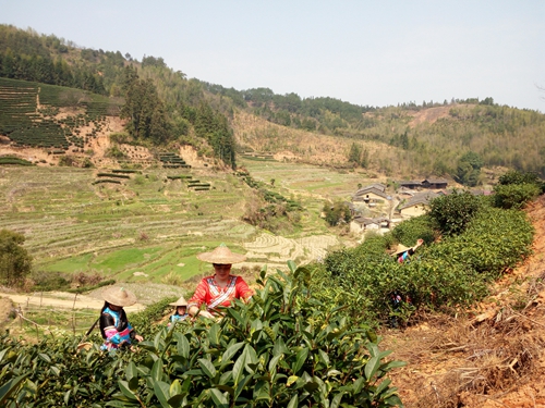 畬民們身著傳統民族服裝,背著茶簍,穿梭茶山忙采茶