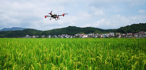 回瑤村種糧大戶使用無(wú)人機(jī)進(jìn)行病蟲害飛防作業(yè)