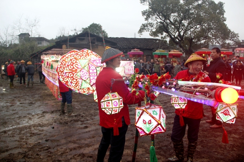 “高照燈”踩街活動準備工作 林劼 攝 3月1日,童游街道彭墩村異常熱鬧,鑼鼓鞭炮齊聲震響,花燈焰火漫天閃耀,一年一度的高照花燈民俗文化踩街活動正在火熱進行,村民們抬著高照花燈沿街出巡,新奇的場景吸引了周邊縣市數千游客前來觀看。 每年農歷正月二十五,正是來彭墩欣賞高照燈的時節,筆者早早來到村里,周圍早已停滿了車輛。在這個重大的節日,外出的村民都盡量趕了回來,與家人團聚。下午五點多鐘,高照花燈隊伍從村頭倪王廟出發,走街串巷,開始了今年的“踩街”活動。 一路鑼鼓鞭炮聲不斷,村民與游客們跟著踩街隊伍,不時發出一聲驚嘆。童游彭墩高照花燈歷史悠久,據道光《建陽縣志》記載,這種燈起源于明代,臻繁于清朝。乾隆年間人云:“紗燈惟蘇州為最,紙燈甲于天下,則莫如建陽也。”童游高照花燈制作工藝精巧,氣勢磅礴。這種巨型紙燈,由12組燈箱和3組旋轉頂燈相疊而成,形體似塔。高照彩燈高達13米,重200公斤,上掛36盞神態各異的花籃子燈裝飾的小彩燈,正面一顆五角紅星閃閃發光,下面一行書寫“金豬賀新春,高照送吉祥”,取吉星高照之意。 當隊伍行至寬敞地段,或主要街道十字路口,高照花燈隊伍便會進行高照花燈表演,表演時需要30人同步操作,齊心豎起,高照花燈豎起時光芒四射,村民也自發燃放鞭炮焰火,頓時,鞭炮齊鳴,鑼鼓喧天,各色焰火禮花沖天而起,響徹云霄,與高照燈交相輝映,璀璨奪目,盛況空前。這支象征著吉祥、太平、富庶的“高照”燈隊的表演把整個春節花燈賽和龍燈賽踩街活動推向了高潮,讓現場群眾大飽眼福。 |