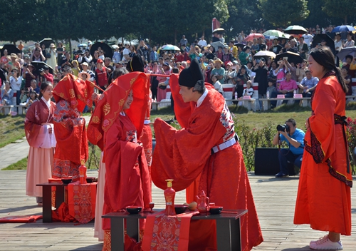 新人挑蓋頭。(張艷紅 攝) 承今秉古,結義之情,悠悠華夏,連理同心。10月19日,朱子誕辰889周年之際, “朱子婚禮”盛典在建陽(臥龍灣)武夷花花世界隆重舉行等領導與游客共同見證10對新人人生濃墨重彩的一頁,重現一場沿襲千年的人文經典婚禮儀式。這也標志著朱子婚禮得以復活、重現,優秀傳統文化得以傳承。 在古樸雅韻的古箏聲中,盛典緩緩拉開序幕,在贊者的主持下,10對新人集體舉行朱子婚禮,循古禮,復傳統,嚴格遵循“朱子婚禮”中的告祖禮、醮子禮、親迎禮、敬拜禮和合巹禮等經典環節,儀式莊重、氣氛隆重、內涵厚重的“朱子婚禮”給現場觀禮者留下深刻的印象,也讓觀禮者充分感受了“朱子婚禮”的人文魅力和文化底蘊。 朱子婚禮,融匯了中華優秀傳統文化“道統”與現實,是對中華優秀傳統文化有力的傳承與弘揚。“朱子婚禮”是朱子《家禮》中的重要一禮,是朱子以中國傳統婚俗禮儀為基礎,充實他所主張的禮儀教化內容,結合崇安縣五夫里民間婚儀習俗,整理、編纂、規范而成的集大成之作,至今已有800多年歷史。這是南平市特有的非物質文化遺產項目,彌足珍貴。近年來,南平市朱子研究會以公益性、群眾性、服務性為出發點,提供集體版、家居版、酒店版等形式的朱子婚禮儀式,讓這傳統婚禮走進民間,深受青年人的尊崇。朱子婚禮已被南平市人民政府列入市級非物質文化遺產名錄,并注冊“朱子婚禮”商標。 據悉,本次活動由南平市朱子文化保護建設工作領導小組辦公室、市文化和旅游局、市社科聯、市朱子文化研究會聯合主辦,由建陽區朱子文化保護建設工作領導小組辦公室、區文化體育和旅游局、區社科聯、區婦女聯合會承辦。旨在進一步傳承和弘揚中國傳統文化,打響“朱子文化”品牌,推進文化與旅游有機融合,進一步延伸建陽婚慶文化旅游產品,提升文化旅游品牌,強化青年一代的傳統人文感知,著力打造具有國際影響力和輻射力的朱子文化新標桿。(張艷紅) |