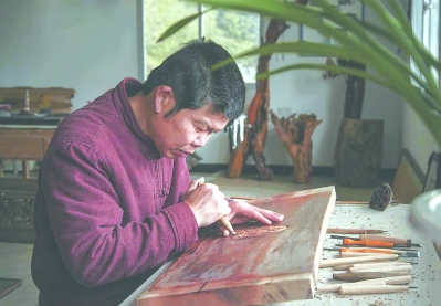 李國平進行建本雕刻。受訪者供圖 建本刻書除經史子集叢五部俱備外,童蒙讀物、農書、醫書等日用雜書也很多,特別是明代通俗小說刊刻蔚然成風。建本的行銷天下,對中國漢文化、民間文藝、儒家經典、科學技術等方面的傳播都起到了重要作用。 但清代之后,由于兵災和文字獄的打擊,加上閩北相對閉塞的地理條件及經濟文化逐步落后的影響,建陽書坊雕版印刷業迅速凋零。清末時僅有少數書院(祠堂)刻印一些族譜、家傳書籍等。現藏于建陽區麻沙鎮文化站的《天臺山五佛菩薩真經》是有據可考的最遲的建本雕版,制作于1949年。 時光流逝,建本一度淡出人們的視野,傳人難覓。幸運的是,在繼承和弘揚優秀傳統文化的號召下,以建本為核心的福建傳統印刷文化保護工作逐漸展開,在地方政府和建本愛好者的不斷推動下,建本“融合發展”腳步也逐漸加快。2005年10月,“建陽建本雕版印刷技藝”列入福建省級非遺保護項目,建本文化研究會、建本協會相繼成立,并陸續評選出12名省市級傳承人。 孜孜不倦的建本匠人 54歲的李國平,初中畢業即與木雕結緣。2015年,他被評選為建本雕版印刷技藝南平市級傳承人。當時,會刻制雕版的匠人寥寥無幾,但李國平沒有故步自封,為了更好地恢復和保護建本雕版印刷技藝,他主動研究學習最傳統的建本雕刻技藝。 建本制作包含裁版、謄寫、描畫、校對、刻版、備紙、調墨、刷印、裝幀等多道工序,其工藝的核心是雕版。 |