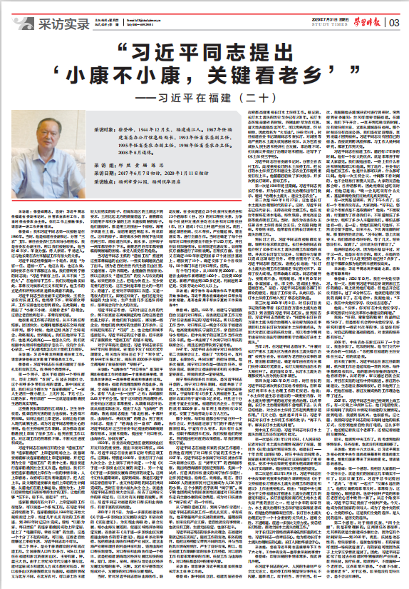 采訪對象:徐登峰,1944年12月生,福建連江人。1987年任福建省委辦公廳信息處處長,1993年任省農委副主任,1995年任省委農辦副主任,1998年任省委農辦主任。2008年8月退休。 采 訪 組:邱 然 黃 珊 陳 思 采訪日期:2017年6月7日初訪,2020年1月11日核訪 采訪地點:福州市芳沁園,福州悅華酒店 采訪組:徐登峰同志,您好!習近平同志任福建省委副書記時,分管農業農村工作,您當時任省委農辦主任。你們工作上接觸很多,請您講一講工作開展情況。 徐登峰:我和習近平同志第一次接觸是在1996年。當時,他是福建省委副書記,分管“三農”工作,兼任省委農村工作領導小組組長,我是省委農辦副主任,所以我們接觸較多。他當時40來歲,年富力強,待人親切,平易近人。這與他長期在農村和基層工作有很大的關系。 習近平同志經常強調一個觀點,就是“為官一任、造福一方”。他這么說,也這么做,同時要求各級干部都這么做。我們曾聽到寧德的同志說:“習近平新官上任,從來不搞‘三把火’。”在他領導下工作,我們發現他確實如此,非常反對搞形式主義和花架子。他工作的立足點和評判標準就是群眾滿意不滿意。 習近平同志當省委副書記的時候,主抓全省農村扶貧工作。他經常下鄉,聽取群眾呼聲,工作安排也處處想到群眾。在此期間,他提出了“小康不小康,關鍵看老鄉”的理念。這話讓老百姓聽起來,非常有親切感。 他很重視工作班子的團結,從來不搞拉幫結派、團團伙伙,處理問題都是站在全局高度來評判。那個時候,他就已經具備了全局觀念、戰略眼光、世界眼光。我們在他領導下工作,也是真心換真心——他怎么交代,我們就根據中央精神和他的指示怎么干,沒有什么私心雜念,一門心思考慮怎么樣才能把工作做好。 采訪組:習近平同志特別重視扶貧工作。請您講講他在這方面做了哪些具體工作。 徐登峰:習近平同志在扶貧方面做了很多扎實有效的工作。我舉兩個典型例子。 第一個例子,是關于福建的一個特殊群體,歷史上叫作“疍民”。在過去封建社會,這個稱呼多少帶有歧視的意思。新中國成立后,我們稱這個群體為“連家船漁民”。“一家人生活在一艘小船上,上無片瓦,下無寸土,以船為家,終日漂泊”——這就是連家船漁民生活的真實寫照。 這些漁民長期漂泊在江河海上,衛生條件極差,抵御自然災害的能力也很弱,生活得不到保障。如何讓他們上岸定居,如何讓他們融入現代城鎮生活,成為習近平同志特別關心的事情。他在主持福州工作期間,就為推動連家船漁民上岸做了很多工作;他到省里工作以后,對這項工作仍然常抓不懈,不斷關注進度和成效。 習近平同志在福州召開的全省“造福工程”暨“連家船漁民”上岸定居現場會上,就強調要徹底解決連家船漁民上岸定居問題,并把它列為全省“造福工程”的重中之重,提出要進行連家船漁民社會主義改造。他指出,我們不要把連家船漁民上岸作為一般的事情來做,人上岸容易,政府可以花錢幫助蓋房子,把人拉上來。最關鍵的是要解決他們上岸后的生計問題,從前他們在船上靠運輸、捕魚為生,上岸以后要給他們安排好維持生計的工作,讓他們能夠“住下來、穩下來、富起來”才行。 連家船漁民有五六千戶,上岸定居的工作很復雜,可以說是一個系統工程。在習近平同志持續推動下,連家船漁民從1998年起開始大規模搬遷上岸,經過幾年扎實有效的工作推進,到2002年時已總體完成。曾經“以船為家、終日漂泊”的連家船漁民成功上岸定居,過上了“電器洋房、幸福安康”的生活,這是一個十分了不起的成就。可以說,這些老百姓能夠過上幸福生活,習近平同志功不可沒。 第二個例子,是關于畬族群眾的茅草房改造工程。全國畬族人口約70多萬,90%以上居住在福建和浙江的貧困山區,主要有雷、鐘、藍三大姓。由于上世紀90年代交通不夠發達,建材運輸成本和建筑人力成本都相對較高,所以很多山區的畬族群眾沒錢蓋房。福建的情況又與北方不同,在北方農村,可以弄土坯來建較大較結實的房子,但閩東地區的土質達不到要求,土坯比起北方的質量差遠了,畬族群眾只能用茅草和少量的土坯來蓋很簡陋的房子。他們蓋房時,都是用土坯圍出一個房框,再用茅草蓋在上面,最后用泥巴糊起來,將就著住。這樣的房子,即使雨水少的情況下也只能住兩三年,而福建臺風多、雨水多,這種房子一兩年都堅持不下來。畬族老百姓年年都要面臨房倒屋塌的困境,承受人員受傷的危險。 當習近平同志主抓的“造福工程”推進到這些非常偏遠的山區時,一些實際問題就凸顯了出來。因為老百姓世世代代生活在山區里,交通閉塞,與外界隔絕,山里面仍然很原始,所以這就涉及“造福工程”的投入與收效的問題。如果把路修上去,把電力供應上,至少要花費幾百萬元,這在當時是非常巨大的一筆開支;路通了,還要對茅草房加以改造,又是一筆很大的開支。即便這樣做了,他們還是身處偏遠的大山深處,生產生活幾乎還是保持原樣,很難說會有什么大的改變。 習近平同志考慮,與其付出這么高的代價,倒不如直接在離城鎮近的地方給這些老百姓蓋上房子,請他們搬下山居住,再發展一些企業,給他們提供更好的生活和工作條件,這樣既把錢用在了“刀刃”上,也讓他們和城市連接起來。習近平同志的這個思路,后來就形成了畬族群眾“造福工程”的基本規劃。 對于茅草