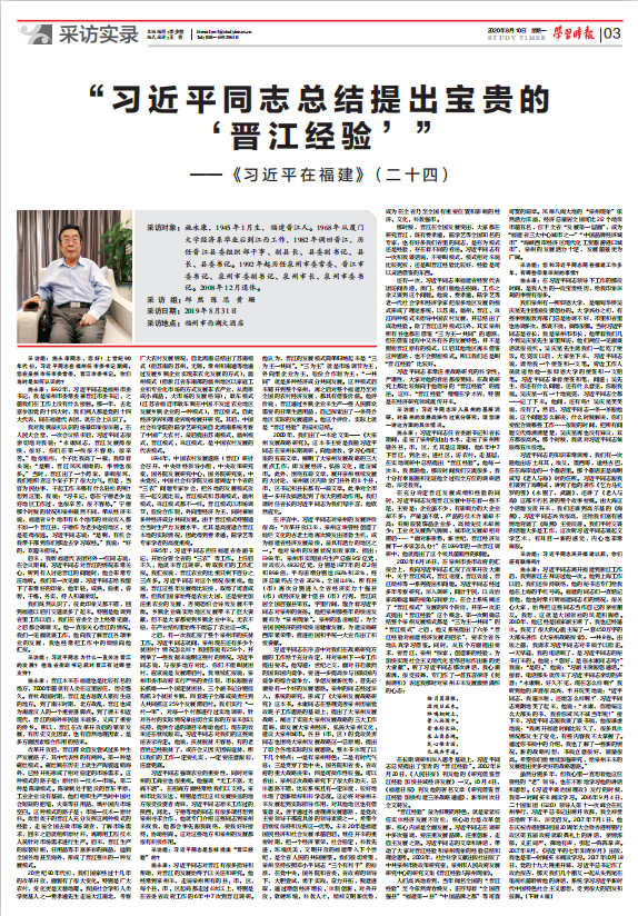 采訪對象:施永康,1945年1月生,福建晉江人。1968年從廈門大學經濟系畢業后到江西工作,1982年調回晉江,歷任晉江縣委組織部干事、副縣長、縣委副書記、縣長、縣委書記。1992年起歷任泉州市委常委、晉江市委書記、泉州市委副書記、泉州市長、泉州市委書記。2008年12月退休。 采 訪 組:邱 然 陳 思 黃 珊 采訪日期:2019年8月31日 采訪地點:福州市西湖大酒店 采訪組:施永康同志,您好!上世紀90年代初,習近平同志在福州任市委書記期間,您在泉州市任市委常委、晉江市委書記。你們當時是如何認識的? 施永康:1992年,習近平同志是福州市委書記,我是泉州市委常委兼晉江市委書記,之前我們在工作上沒有什么接觸。那一年,去北京參加黨的十四大時,我們兩人都是黨的十四大代表,同在福建代表團,就在會上認識了。 我對我倆最初認識的場景印象很深刻。在人民大會堂,一次會議結束后,習近平同志很親切地對我說:“永康同志,晉江發展得很快,很好,你們在第一線很不容易,很辛苦。”他很魁梧,個子比我高了一截,我仰著頭說:“是啊,晉江風風雨雨的,事情也很多。”當時,晉江出了一個藥案,影響很壞,我們組織查這個案子下了很大力氣。但是,當官為民辦事,干起工作來哪有什么輕松的呢?想到這里,我說:“習書記,您在寧德老少邊窮地區工作過,也很辛苦,很不容易。”寧德那個時候的狀況和泉州截然不同,單從經濟來說,福建省9個地市有6個地市的財政收入都不如一個晉江縣,寧德作為老少邊窮地區,更是差得很遠。習近平同志說:“是啊,有機會我帶干部到你們那邊去學習取經。”我說:“好的,歡迎來指導。” 后來,我聽福建代表團另外一位同志說,在會議期間,習近平同志對晉江的情況非常關心,聽到有人討論晉江的問題時,他會非常專注地聽。我們第一次見面,習近平同志給我留下了非常好的印象,他年輕、成熟、穩重、睿智、干練、務實,待人和藹親切。 我們既然認識了,彼此印象又都不錯,回到福建以后打交道就多了起來。特別是他調到省里工作以后,我們在省委全會上經常見面,之后都會聊聊天。他一直很關心晉江的情況。我們一見面就談工作,他向我了解晉江各項事業的發展,我也經常把工作中的煩惱向他匯報。 采訪組:習近平同志為什么一直關注晉江的發展?他當省委副書記后對晉江有過哪些支持? 施永康:晉江本來在福建也是比較有名的地方,7000年前就有人類在這里居住,歷史悠久。春秋戰國時期,晉江是古越族人繁衍生息的地方。到了南宋時期,北方戰亂,晉江也成為南渡漢人的一個重要落腳點。到了清末和近現代,晉江的海外移民越來越多,又成了重要的僑鄉。所以,晉江在改革開放后的繁榮發展,有歷史文化因素,也有自然地理因素,是多方面因素綜合作用的結果。 改革開放后,晉江群眾自發嘗試過多種生產發展路子,其中代表性的有兩種。第一種是磁灶模式。磁灶鎮在歷史上就生產陶瓷遠銷海外,已經開拓形成了相對穩定的市場需求。這種模式的路子是:原材料—技術—市場。第二種是陳埭模式。陳埭鎮處于肥沃的晉東平原,工業企業沒有基礎,他們組織生產當時中國社會短缺的肥皂、火柴等日用品,填補國內市場空白。這種模式的路子是:市場—技術—原材料。敢想敢干的晉江人充分發揮這兩種模式的經驗,走遍全國去做市場調查,了解市場需求,回來之后就組織原材料,再聘用工程技術人員針對市場需求進行生產。后來,晉江生產的服裝鞋帽、日用品等豐富多彩的商品,遠銷全國各地甚至海外,形成了晉江整體的一種發展模式。 20世紀90年代初,我們國家經過十幾年的改革開放,面貌有了很大變化。特別是廣大農村,變化更是天翻地覆。我國社會學和人類學奠基人之一費孝通先生走遍大江南北,考察廣大農村發展情況,自北而南總結出了蘇南模式(指蘇南的蘇州、無錫、常州和南通等地通過發展鄉鎮企業實現非農化發展的方式)、溫州模式(指浙江省東南部的溫州地區以家庭工業和專業化市場的方式發展非農產業,從而形成小商品、大市場的發展格局)、耿車模式(江蘇省宿遷市耿車鎮在中國不發達農業地區發展鄉鎮企業的一種模式)、晉江模式。自此經濟學界和理論界紛紛展開研究。其后,中國社會科學院的陸學藝研究員自北而南系統考察了中國廣大農村,最后提出蘇南模式、溫州模式、晉江模式、珠江模式,是中國農村發展的代表模式。 1994年,中國農村發展道路(晉江)研討會召開,中央財經領導小組、中央政策研究室、國務院發展研究中心、國務院研究室、中央黨校、中國社會科學院及福建周邊十個省的“三農”問題專家參會,把各地的發展模式放在一起交流比較。晉江模式和蘇南模式、溫州模式、珠江模式都不一樣。晉江模式以市場調節、股份合作制、外向型經濟為主,同時兼顧多種經濟成分共同發展。由于晉江模式特別適合當時生產力發展水平,尤其是高度適合晉江本地的實際情況,因此得到費孝通、陸學藝等專家學者的高度重視。 1995年,習近平同志擔任福建省委副書記,開始分管全省的“三農”等工作。上任后不久,他就來晉江調研,聽取我們的工作匯報。我匯報說,晉江農業的比重只剩下百分之三點多。習近平同志對這個情況很重視。他說,晉江這些年發展得比較快,取得了可喜成績,但我們國家始終是農業大國,還是要更加注重農業的發展,否則恐怕會