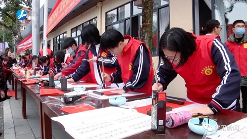 1月28日,由建陽團區委、建陽一中團委聯合舉辦的“筆墨寫春意·春聯送虎福”志愿服務公益活動在建陽一中校友公益書吧舉行。 來自區委宣傳部、區婦女聯合會、區文聯、老年大學書法研究會及建陽一中的學生志愿者們,提筆揮毫,各顯身手,將心中愿景、祝福注入筆墨里,創作出一副副寓意吉祥的對聯,免費贈予過往市民,為即將來臨的春節增添了濃濃的喜慶氛圍。(江潔 池魏揚) |