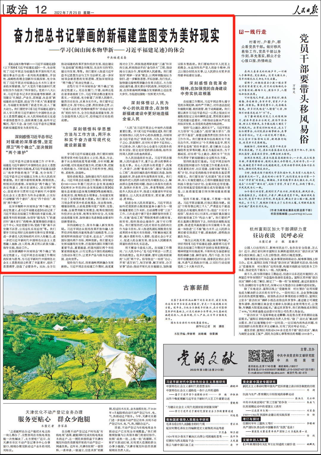 7月25日,《人民日報》刊發由中共福建省委撰寫的《奮力把總書記擘畫的新福建藍圖變為美好現實——學習<閩山閩水物華新——習近平福建足跡>的體會》,文章指出,《閩山閩水物華新——習近平福建足跡》一書,生動展現了習近平同志為福建改革開放和現代化建設事業作出的一系列極具前瞻性、開創性、戰略性的理念創新和實踐探索,充分體現了習近平同志對福建山山水水和父老鄉親的深厚感情,為廣大黨員干部在新時代更好擔當作為提供了科學指引。我們要把學習《習近平福建足跡》與深入學習貫徹習近平新時代中國特色社會主義思想貫通起來,從人民領袖的成長足跡中感悟思想偉力、汲取真理力量,始終牢記囑托、篤行不怠,奮力把習近平總書記擘畫的新福建藍圖變為美好現實。 奮力把總書記擘畫的新福建藍圖變為美好現實 ——學習《閩山閩水物華新——習近平福建足跡》的體會 中共福建省委 《 人民日報 》( 2022年07月25日 第 12 版) 《閩山閩水物華新——習近平福建足跡》(以下簡稱《習近平福建足跡》)一書,生動展現了習近平同志為福建改革開放和現代化建設事業作出的一系列極具前瞻性、開創性、戰略性的理念創新和實踐探索,充分體現了習近平同志對福建山山水水和父老鄉親的深厚感情,為廣大黨員干部在新時代更好擔當作為提供了科學指引。黨的十八大以來,習近平總書記多次到福建考察調研,謀劃建設“機制活、產業優、百姓富、生態美”新福建的宏偉藍圖,提出“四個更大”的重要要求,為福建發展指明了前進方向、注入了強大動力。我們要把學習《習近平福建足跡》與深入學習貫徹習近平新時代中國特色社會主義思想貫通起來,從人民領袖的成長足跡中感悟思想偉力、汲取真理力量,始終牢記囑托、篤行不怠,奮力把習近平總書記擘畫的新福建藍圖變為美好現實。 深刻感悟習近平總書記對福建的深厚感情,堅定捍衛“兩個確立”、堅決做到“兩個維護” 習近平總書記曾在福建工作17年半,福建是習近平新時代中國特色社會主義思想的重要孕育地和實踐地。《習近平福建足跡》以“魂牽夢繞的地方”開篇,充分體現了習近平總書記對福建這方熱土和人民的深厚感情。我們要懷著特別真摯、特別熾熱、特別深沉的感情,深刻領會“兩個確立”的決定性意義,絕對忠誠核心、堅定擁護核心,自覺將學習貫徹習近平新時代中國特色社會主義思想作為終身必修課,以實際行動增強“四個意識”、堅定“四個自信”、做到“兩個維護”。 在深學細照中深刻領會“兩個確立”的決定性意義。《習近平福建足跡》生動記錄了習近平同志在福建工作期間的豐富實踐、深邃思考和探索創新,如倡導“弱鳥先飛”的意識和“滴水穿石”的精神;緊緊圍繞經濟建設這個中心,突出黨建引領;黨政干部“廉不訴窮勤不訴苦,公而忘私樂而忘憂”等。我們要學習好運用好這些獨特優勢和寶貴財富,進一步感受人民領袖的風采和人格魅力,進一步把習近平新時代中國特色社會主義思想融入血脈、注入靈魂,真正用以武裝頭腦、指導實踐、推動工作。 在探源溯源中深刻領會“兩個確立”的決定性意義。習近平同志在福建工作期間的探索與思考,為習近平新時代中國特色社會主義思想的創立積累了豐富素材、提供了思想萌芽、創造了必要條件。比如,全方位推動福建的改革開放和經濟發展,提出建設“生態福建”的理念和規劃,關注和支持軍隊建設和發展,等等。我們要深入推進習近平總書記思想方法與工作方法研究,進一步深刻領會新思想的發展邏輯,更加深刻領會“兩個確立”的決定性意義。 在篤行實干中深刻領會“兩個確立”的決定性意義。無論在廈門、寧德、福州還是在省委省政府工作,習近平同志都注重躬身落實、一抓到底,充分彰顯了深厚人民情懷、強烈歷史擔當、求真務實作風。我們要牢記履職之本、堅守初心之要、勇擔使命之責,以“功成不必在我”的精神境界和“功成必定有我”的擔當作為,全方位推進高質量發展,努力創造得到人民認可、經得起歷史檢驗的成績。 深刻領悟科學思想方法與工作方法,用汗水和實干奮力譜寫現代化建設新篇章 學習《習近平福建足跡》,我們要深刻領悟貫穿其中的馬克思主義立場、觀點、方法,善于從全局的高度考慮問題、分析問題、解決問題,切實提高把握方向、把握大勢、把握大局的能力,不斷提高工作的科學性、預見性、系統性、創造性。 堅持系統觀念,加快建設現代化經濟體系。習近平同志在福建工作期間,領導制定《1985—2000年廈門經濟社會發展戰略》《福州市20年經濟社會發展戰略設想》《福建生態省建設總體規劃綱要》等戰略規劃,系統謀劃、統籌推進各項事業,為福建發展作出了全局性的重大貢獻。我們要深入學習領會貫穿其中的系統觀念,突出整體性、增強協同性,以系統思維和寬廣視野,完整、準確、全面貫徹新發展理念,統籌疫情防控和經濟社會發展,統籌發展和安全,扎實推動高質量發展,加快建設先進制造業強省和創新型省份。 保持戰略定力,服務和融入新發展格局。習近平同志從堅持改革開放和融入世界經濟格局的深邃視角進行戰略思考,以全球視野積極推動“引進來、走出去”,利用好國際國內兩個市場、兩種資源。我們要充分發揮福建現有優勢,打造國內國際雙循環的重