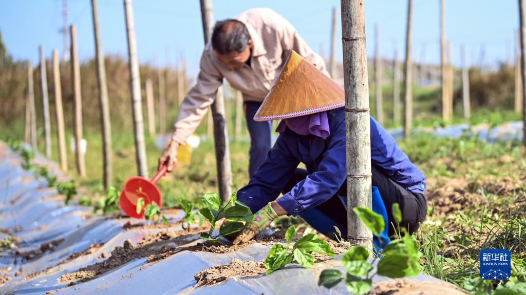 在欽州市三娘灣黃金百香果種植園,農民在種植黃金百香果苗(12月14日攝)。