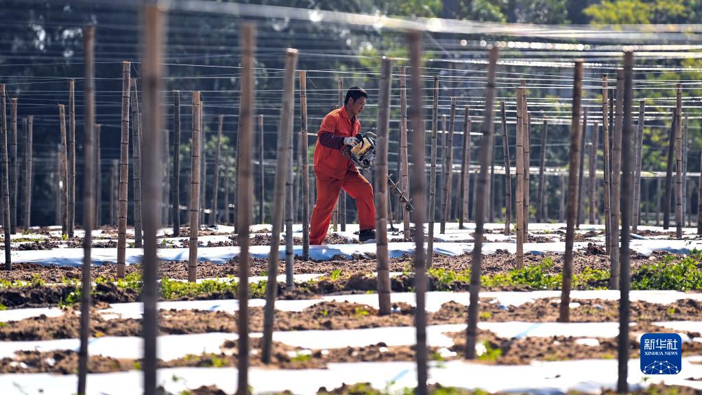 在欽州市三娘灣黃金百香果種植園,一名農民在搭建黃金百香果苗架(12月14日攝)。