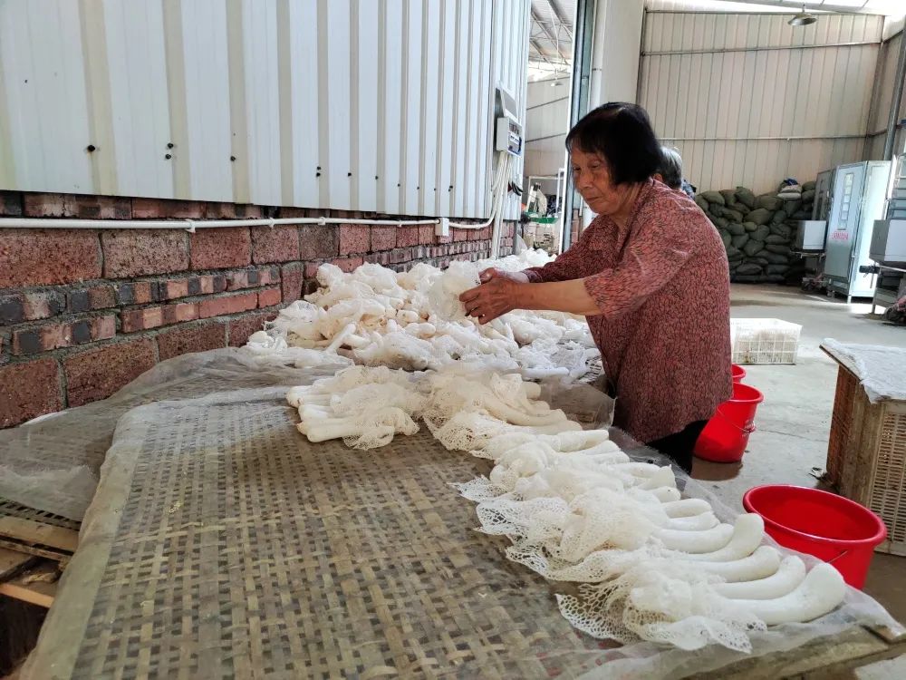 6月,建陽(yáng)區(qū)崇泰街道彭墩村興農(nóng)農(nóng)機(jī)專業(yè)合作社的長(zhǎng)裙竹蓀迎來(lái)了采摘旺季。 走進(jìn)竹蓀的種植棚內(nèi),大棚里滿地的竹蓀蛋爭(zhēng)相萌發(fā),長(zhǎng)勢(shì)十分喜人。一朵朵竹蓀舒展自己潔白的裙擺,種植大棚內(nèi)清香彌漫,務(wù)工的村民們?cè)诖笈锢锊烧⒎謷⒀b筐,討論著這批竹蓀的長(zhǎng)勢(shì)和產(chǎn)量,雖然忙碌,卻也掩飾不住內(nèi)心的喜悅。 每天的早晨6時(shí)至10時(shí)是竹蓀采摘的“黃金時(shí)間”。隨著溫度的升高,竹蓀生長(zhǎng)速度開始加快,散裙后的竹蓀如披著一層薄薄的網(wǎng)狀白紗,極不易采摘。“我們每天來(lái)這里采竹蓀,收入還是很不錯(cuò)的,一個(gè)早上能賺60塊錢呢。”村民劉天素說道。像劉天素這樣的村民還有10余位,采摘竹蓀為他們?nèi)司鍪樟?000余元,在家門口盡享就業(yè)的幸福。 “今年竹蓀的價(jià)格,目前市場(chǎng)價(jià)批發(fā)是130元/斤,零售的話可以達(dá)到150元/斤。而且啊,我們的銷路根本不用愁,有時(shí)候還不夠賣呢!”興農(nóng)農(nóng)機(jī)專業(yè)合作社負(fù)責(zé)人林貴富介紹到。 林貴富是村里有名的種植大戶,也是今年剛選上的南平市鄉(xiāng)土科特派推廣員。1987年他開始嘗試自己種植竹蓀,積攢了多年種植經(jīng)驗(yàn)的林貴富,看著種植竹蓀帶來(lái)的經(jīng)濟(jì)效益越來(lái)越好,身為彭墩村黨支部副書記的他,一顆“振興鄉(xiāng)村”的心早已按捺不住,2022年林貴富帶領(lǐng)著興農(nóng)農(nóng)機(jī)專業(yè)合作社175名社員們開始種植竹蓀,目前他已帶領(lǐng)合作社的社員們投入10萬(wàn)余元竹蓀種植,共種植竹蓀20畝,每年可采摘3批,每畝產(chǎn)量預(yù)計(jì)可達(dá)160至200斤,預(yù)計(jì)增收20余萬(wàn)元,一朵朵潔白的竹蓀托起了彭墩村的富民新希望。(黃慧聰) |