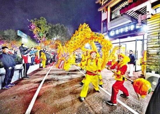 龍年春節,武夷山圍繞“龍騰大武夷”主題,開展一系列精彩紛呈的民俗文化活動,為假日旅游引人潮、添活力。圖為11日,年味滿滿的舞龍賀歲表演在度假區上演,吸引眾多市民游客觀看。(張筱惜 攝)