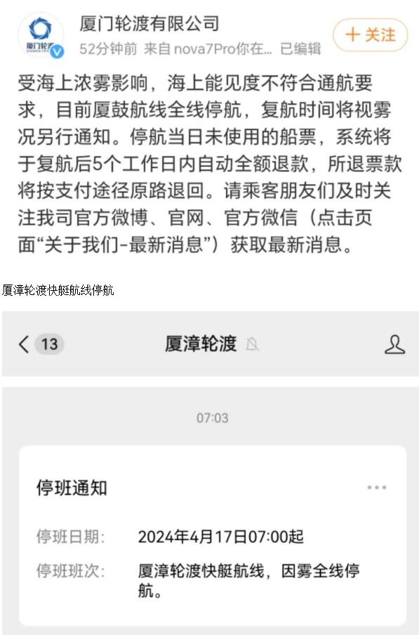 2024-04-17 10:53:22? 作者:   來源:廈門天氣在線、廈漳輪渡、@廈門輪渡有限公司   責任編輯:肖練冰