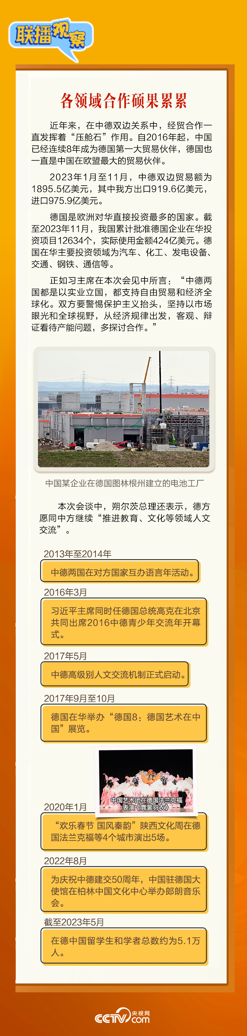 4月16日上午,習近平主席在北京釣魚臺國賓館會見朔爾茨總理。會見中,習主席強調,要“牢牢把握中德是全方位戰略伙伴這一定位”。中德建立全方位戰略伙伴關系10年來,兩國如何共同發展,相互成就?央視網《聯播觀察》帶您了解。