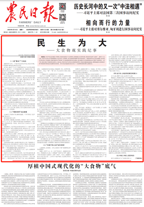 5月13日 多家央媒紛紛聚焦 福建在踐行大食物觀上的探索與成效 人民日報、新華社 中央廣播電視總臺 中國新聞網、農民日報等 相繼刊發報道 一起來看—— 人民日報 5月13日,人民日報頭版刊發通訊《福建踐行大食物觀構建多元化食物供給體系》和“仲音”評論《樹立和踐行大食物觀》,聚焦30多年來福建踐行大食物觀,開發利用豐富的山海資源,因地制宜構建多元化食物供給體系,取得顯著成效。 新華社 5月13日,新華社發布《豐富食物“資源庫” 唱好農業“山海經”——福建深入踐行大食物觀的經驗啟示》,關注30多年來,福建干部群眾始終牢記囑托,在大食物觀科學指引下,穩定發展糧食生產,培育形成畜禽、漁業、蔬果、茶葉、食用菌等特色產業,大力發展設施農業,不斷破解糧源局限,構建多元化食物供給體系取得顯著成效。 中央廣播電視總臺 5月13日,總臺央視《新聞聯播》播出《踐行大食物觀的福建啟示 因地制宜 走特色發展之路》,聚焦30多年來,福建立足農業資源多樣性和氣候適宜優勢,向海洋要食物,向森林要食物,向設施農業要食物,因地制宜推動特色現代農業轉型,構建多元化食物供給體系。 中國新聞網 5月13日,中國新聞網刊發《面向綠水青山 習近平大食物觀蘊意深》并配發《圖說福建踐行大食物觀:特色產業開“食”源》,提到30多年來,福建踐行大食物觀,開發利用豐富的山海資源,因地制宜構建多元化食物供給體系;堅持走特色路、打特色牌,因地制宜發展茶葉、蔬菜、水果、畜禽、水產、食用菌等鄉村優勢特色產業,推動全產業鏈發展、全產業鏈提升。 空中俯瞰寧德三都澳海上大黃魚養殖基地。中新網記者 王東明 攝 農民日報 5月13日,農民日報頭版刊發通訊《民生為大——大食物觀實踐紀事》,提到福建始終牢記總書記的囑托,努力踐行大農業觀、大食物觀,在穩定糧食生產的同時,大力推動特色現代農業建設,著力構建多元化食物供給體系,取得了顯著成效。 |
