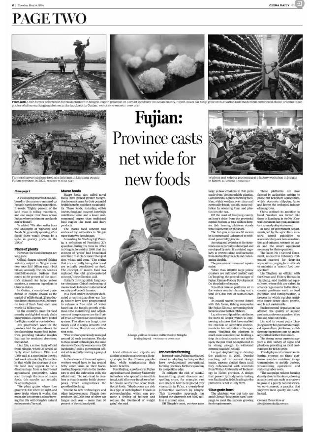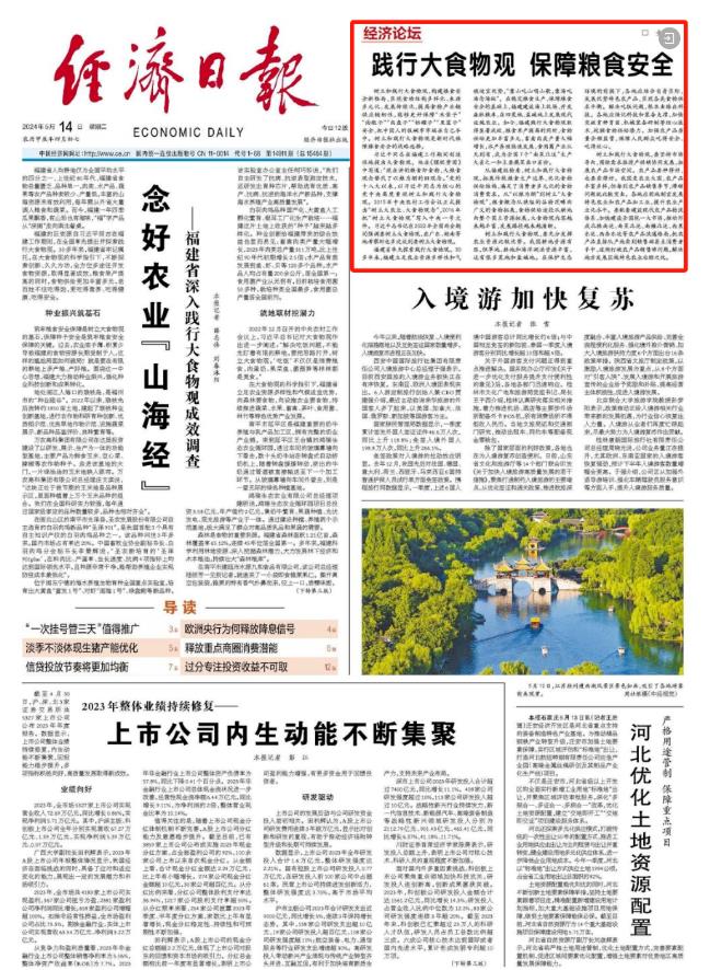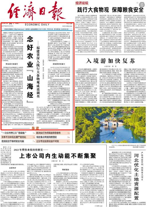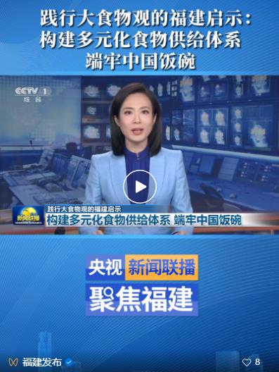 5月14日 中央主要媒體 繼續在顯著位置 關注福建踐行大食物觀的 實踐和經驗 ↓↓↓ 人民日報 5月14日,《人民日報》要聞版刊發文章《福建加快建設“藍色糧倉” 推進海洋漁業高質量發展》,聚焦福建“向海洋要食物”的積極探索。 中央廣播電視總臺 5月14日,總臺央視《新聞聯播》播出《踐行大食物觀的福建啟示 構建多元化食物供給體系 端牢中國飯碗》,關注福建食物供給豐富多元,展現大食物觀的實踐力量。 5月14日,總臺央視《新聞直播間》欄目播出《“食”在山海間 大黃魚搬家 “海上牧場走向深藍”》,關注福建連江提升養殖技術,探索打造深遠海養殖新模式。 此外,欄目還播出《“食”在山海間 福建人的“花式養魚”》,聚焦福建三明市泰寧縣和福建寧德市三都澳的生態養殖,踐行大食物觀。 5月14日,中央人民廣播電臺《新聞和報紙摘要》播發報道《踐行大食物觀的福建啟示丨因地制宜 走特色發展之路》。 經濟日報 5月14日,《經濟日報》頭版刊發文章《念好農業“山海經”——福建省深入踐行大食物觀成效調查》,關注福建全方位多途徑開發食物資源,取得的顯著成效。 《經濟日報》同時配發評論文章《踐行大食物觀 保障糧食安全》。 中國日報 5月14日,《中國日報》刊發《Fujian's innovations lead nation's quest for food security》 |