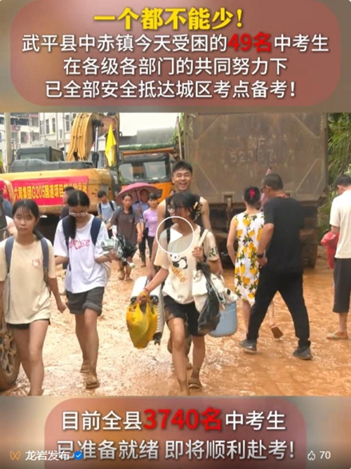 “學生安全是頭等大事,一個都不能離開教學樓。”說完這句話,手機信號就此中斷。此后,曾慶營、林華英等在校老師扛起了抗洪和保護學生安全的責任。為了安撫學生的情緒,當晚7名在校老師陪伴100多名學生在教學樓休息,守護學生們的安全。 巖前中學老師陪伴學生在教學樓休息。圖源:武平發布 17日一大早,縣教育局局長鐘建暉等第一時間奔赴學校查看災情,并立即部署中考考點平移工作。據了解,在此之前巖前中學設了中考考點,包括巖前中學考生297名,象洞中學考生63名。縣里決定將考點平移至武平二中,馬上對考點進行布置,并按考試要求調試通訊、監控、播音等中考必需設備。 武平巖前中學考生排隊進入考場。圖源:龍巖發布 18日上午,看著全部297名考生在巖前中學集合完畢,老師們感慨萬千,紛紛流下了動情的淚水。 今天上午,武平全縣3470名中考考生全部安全參加中考。