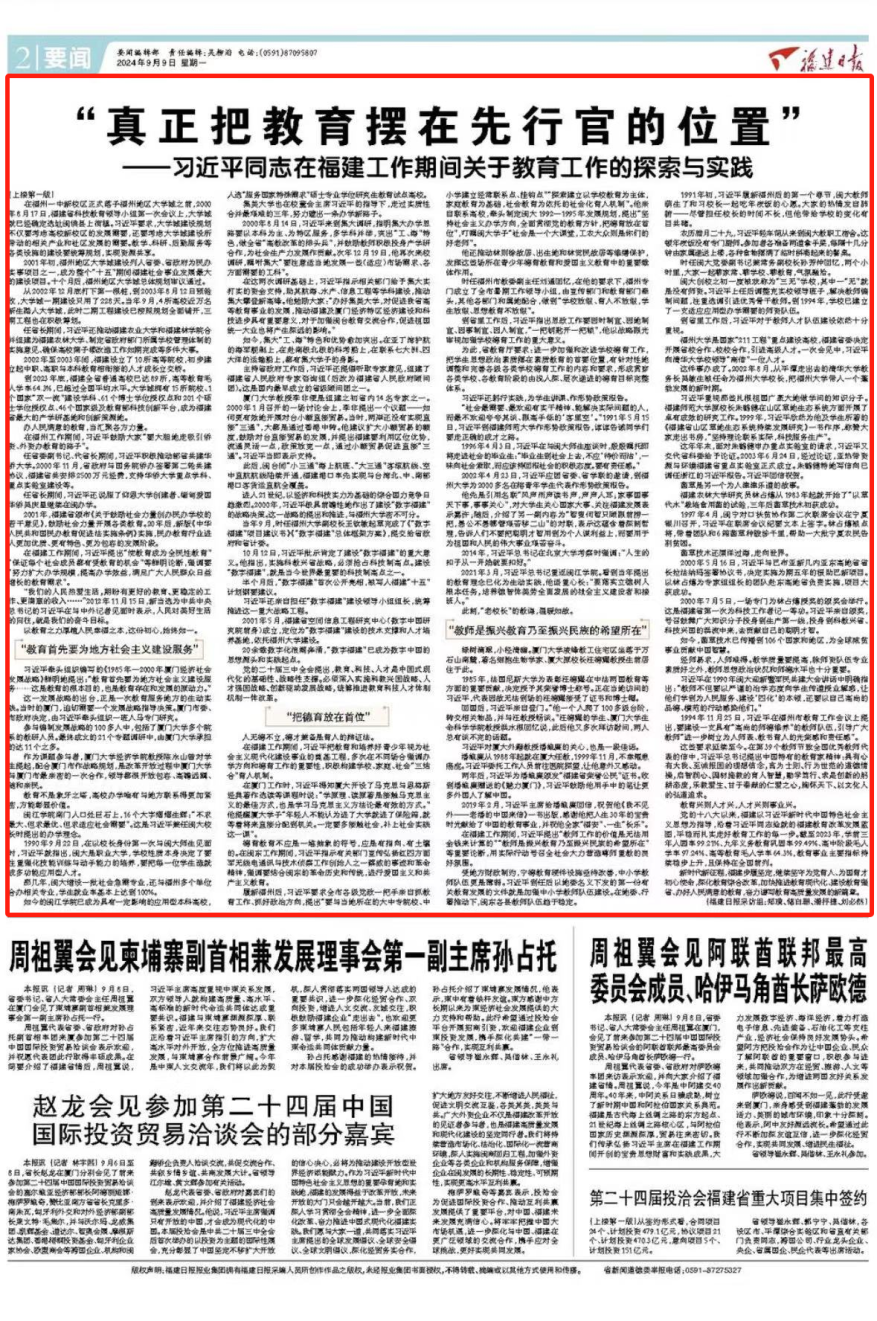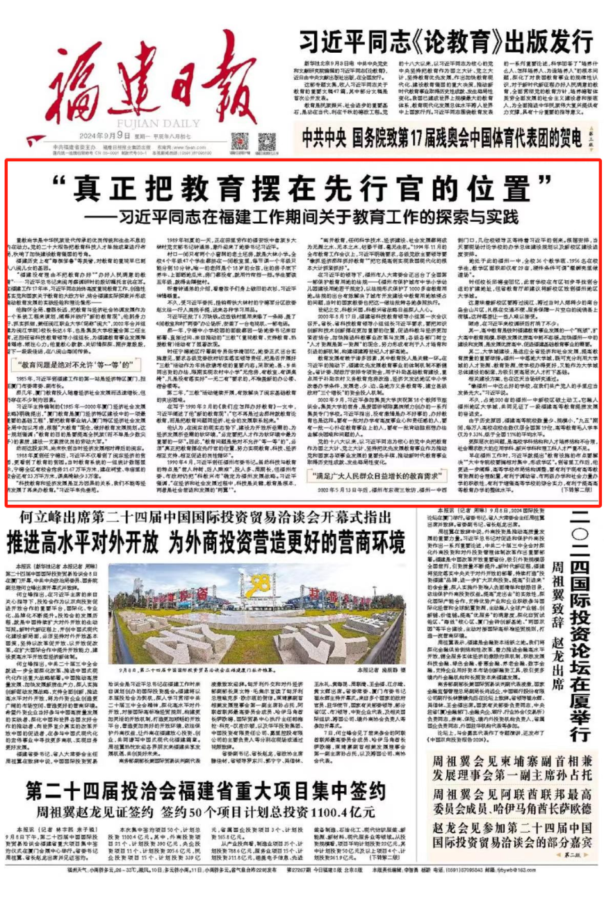 今天,《福建日報》一版和二版刊發《“真正把教育擺在先行官的位置”——習近平同志在福建工作期間關于教育工作的探索與實踐》,全文如下: 《福建日報》2024年9月9日第01版 《福建日報》2024年9月9日第02版 重教尚學 是中華民族世代傳承的優良傳統 和生生不息的內在動力 黨的二十大報告 把教育科技人才單獨成章進行布局 吹響了加快建設教育強國的號角 福建歷史上有“海濱鄒魯”等美譽 對教育的重視 早已刻入八閩兒女的基因 “福建沒有理由不把教育辦好”“辦好人民滿意的教育”……習近平總書記來閩考察調研時的殷切囑托言猶在耳。在福建工作17年半,習近平同志始終高度重視教育工作,創造性落實黨和國家關于教育的大政方針,結合福建實際探索并形成推動教育發展的實踐經驗和理論雛形—— 他胸懷全局、著眼長遠,把教育與經濟社會協調發展作為一個系統工程來謀劃,闡釋并踐行“新的教育觀”;他躬身力行、抓實抓細,兼任閩江職業大學(簡稱“閩大”,2002年合并組建為閩江學院)校長長達6年,也是集美大學校董會第二任主席,還擔任省科技教育領導小組組長,為福建教育事業發展殫精竭慮、傾注心力;他重教心款款、關切情深深、期許意殷殷,留下一段段佳話,在八閩山海間傳揚。 “教育問題是絕對不允許‘等一等’的” 1985年,習近平到福建工作的第一站是經濟特區廈門,擔任廈門市委常委、副市長。 那幾年,廈門教育投入隨著經濟社會發展而迅速增長,但仍存在不少制約因素。 習近平主持編制的《1985年—2000年廈門經濟社會發展戰略》明確提出,“廈門教育是廈門經濟特區建設中的一項最重要的基礎工程”,要把教育事業納入廈門特區經濟社會發展全局中加以考慮,根據“大教育”觀念,做好教育發展規劃。這一規劃強調: “教育的目的是要提高全民族(而不單是少數尖子)的素質,建設一支素質優良的勞動大軍。” 然而這股東風,尚未吹到當時經濟發展相對滯后的閩東。 1988年夏到任寧德后,習近平不僅看到了閩東經濟的貧困,更看到了教育的貧困。當時教育系統的一組統計數據顯示,寧德全區有校舍危房21.67萬平方米,建在祠堂、寺廟里的校舍還有23萬平方米,課桌椅缺少3萬套。 “科技教育和經濟發展是互為因果的關系,我們不能等經濟發展了再來辦教育。”習近平率先垂范。 1989年初夏的一天,正在田里勞作的福安坂中畬族鄉大林村黨支部書記鐘通弟,意外迎來了地委書記習近平。 村口一間只有兩個小窗洞的老土坯房,就是大林小學。全校4個年級47個學生都擠在一間教室里,每節課一個年級只能分到10分鐘。唯一的老師是個18歲的女孩,住的房子底下養牛、上面曬地瓜米,房門都沒有,就用竹簾擋一擋。學生要讀五年級,就得去隔壁村。 聽著鐘通弟的介紹,看著孩子們身上破舊的衣衫,習近平神情凝重。 不久,受習近平委托,掛鉤幫扶大林村的寧德軍分區政委趙文法一行人肩挑手提,送來各種學習用品。 習近平還批了6萬塊錢。這些錢村里用來修了一條路,蓋了4間教室和村“兩委”辦公場所,安裝了一臺電視機、一部電話。 那一年,寧德中小學校園的面貌都因一場地委書記親自部署、直接過問、親自推動的“三教”(重視教育、支持教育、熱愛教育)活動有了顯著改觀。 時任寧德地區行署副專員張學清回憶,地委正式出臺實施意見,要求各級黨委政府切實落實領導責任,把是否開展好“三教”活動作為年終政績考核的重要內容;采取地、縣、鄉共同出資的辦法,限期實現農村中小學“無危房,有教室、有課桌椅”,凡是沒有落實好“一無二有”要求的,不準蓋新的辦公樓、宿舍樓等。 第二年,“三教”活動繼續開展,有效解決了閩東基礎教育的突出困難。 《我們應怎樣辦好教育》一文中,習近平闡述了他“新的教育觀”: “它不再是過去那種就教育論教育,而是把教育問題同經濟、社會的發展聯系起來。” 他認為,在閩東的現實態勢下,建設為開放所亟需的、為經濟發展所亟需的軟環境,“必定要把人才作為軟環境中最為重要的一環”。因此,“教育問題是絕對不允許‘等一等’的”,必須“真正把教育擺在先行官的位置,努力實現教育、科技、經濟相互支持、相互促進的良性循環”。 1990年4月,習近平到任福州市委書記。雖然科技與教育的特點是“前人種樹,后人乘涼”,投入多、周期長,但福州市委、市政府仍把“科教興市”確定為福州發展戰略。習近平強調,“在經濟和社會發展過程中,科技是關鍵,教育是根本,兩者是社會前進和發展的‘兩翼’”。 “離開教育,任何科學技術、經濟建設、社會發展都將成為無源之水、無本之木,枯萎干涸、毫無生機。”1994年11月的全市教育工作會議上,習近平明確要求,各級黨政主要領導要“像抓經濟那樣抓好教育”“把它提高到實現我國現代化的根本大計抓緊抓好”。 在習近平的領導下,福州市人大常委會還出臺了全國第一部保護教育用地的法規——《福州市保護城市中學小學幼兒園建設用地若干規定》,以法規形式保護了1000多畝教育用地。法規的出臺有效解決了城市開發建設中教育用地被侵占的問題,當時的國家教委也把這一做法批轉各地參照執行。 世紀之交,科教興國、科教興省戰略日益深入人心。 2000年8月17日,福建省科技教育領導小組第一次會議召開。省長、省科技教育領導小組組長習近