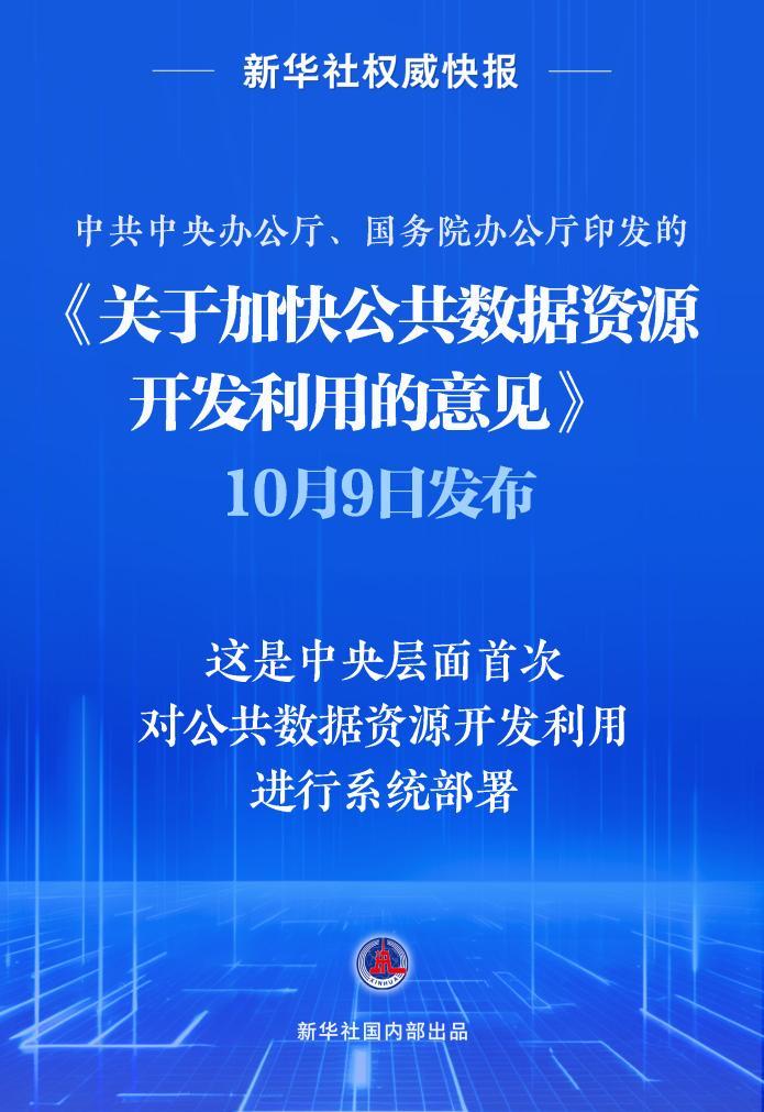 中共中央辦公廳、國(guó)務(wù)院辦公廳印發(fā)的《關(guān)于加快公共數(shù)據(jù)資源開發(fā)利用的意見》10月9日發(fā)布,這是中央層面首次對(duì)公共數(shù)據(jù)資源開發(fā)利用進(jìn)行系統(tǒng)部署。 意見提出,到2025年,公共數(shù)據(jù)資源開發(fā)利用制度規(guī)則初步建立,資源供給規(guī)模和質(zhì)量明顯提升,數(shù)據(jù)產(chǎn)品和服務(wù)不斷豐富,重點(diǎn)行業(yè)、地區(qū)公共數(shù)據(jù)資源開發(fā)利用取得明顯成效,培育一批數(shù)據(jù)要素型企業(yè),公共數(shù)據(jù)資源要素作用初步顯現(xiàn)。 意見提出,到2030年,公共數(shù)據(jù)資源開發(fā)利用制度規(guī)則更加成熟,資源開發(fā)利用體系全面建成,數(shù)據(jù)流通使用合規(guī)高效,公共數(shù)據(jù)在賦能實(shí)體經(jīng)濟(jì)、擴(kuò)大消費(fèi)需求、拓展投資空間、提升治理能力中的要素作用充分發(fā)揮。 意見圍繞深化數(shù)據(jù)要素配置改革,擴(kuò)大公共數(shù)據(jù)資源供給;加強(qiáng)資源管理,規(guī)范公共數(shù)據(jù)授權(quán)運(yùn)營(yíng);鼓勵(lì)應(yīng)用創(chuàng)新,推動(dòng)數(shù)據(jù)產(chǎn)業(yè)健康發(fā)展;統(tǒng)籌發(fā)展和安全,營(yíng)造開發(fā)利用良好環(huán)境4個(gè)方面,部署加快推進(jìn)公共數(shù)據(jù)資源開發(fā)利用工作。 |