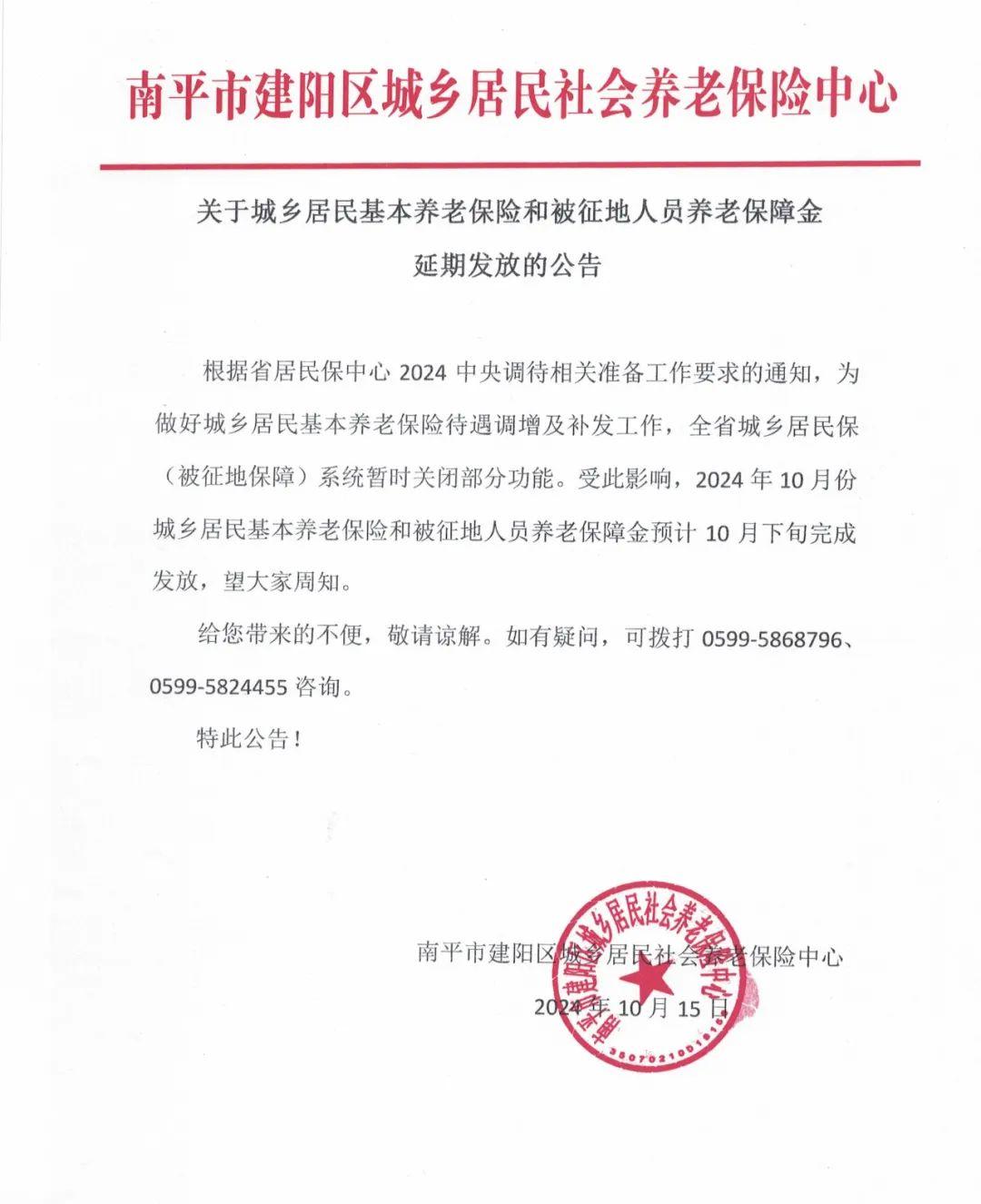 關于城鄉居民基本養老保險和被征地人員養老保障金延期發放的公告