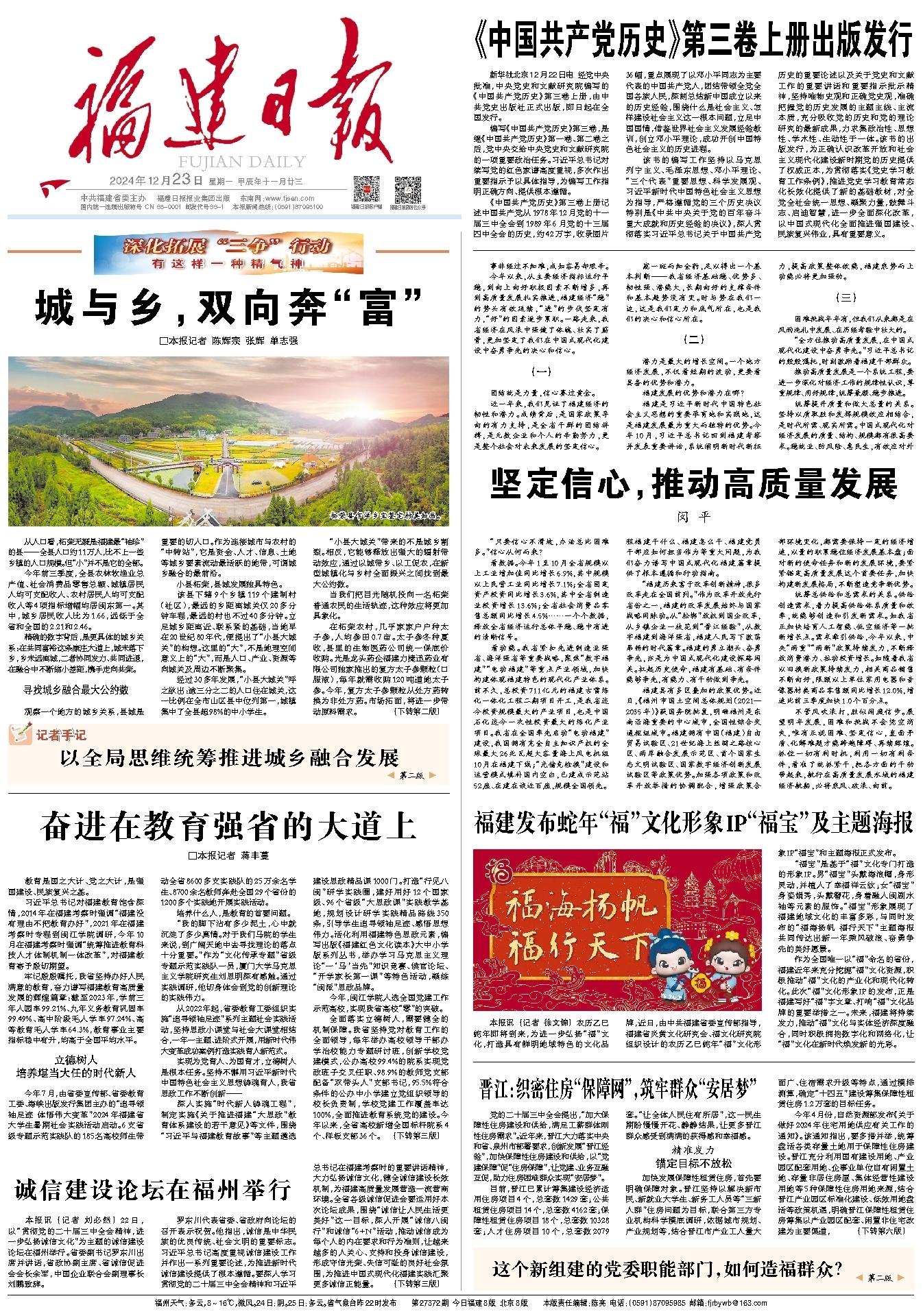 本報訊 (記者 徐文錦) 農歷乙巳蛇年即將到來,為進一步弘揚“福”文化,打造具有鮮明地域特色的文化品牌,近日,由中共福建省委宣傳部指導,福建省炎黃文化研究會、福文化研究院組織設計的農歷乙巳蛇年“福”文化形象IP“福寶”和主題海報正式發布。 “福寶”是基于“福”文化專門打造的形象IP。男“福寶”頭戴海浪帽,身形靈動,并植入了幸福祥云紋;女“福寶”身姿娟秀,頭戴簪花,身著融入閩劇水袖等元素的服飾。“福寶”形象展現了福建地域文化的豐富多彩,與同時發布的“福海揚帆 福行天下”主題海報共同傳達出新一年乘風破浪、奮勇爭先的美好愿景。 作為全國唯一以“福”命名的省份,福建近年來充分挖掘“福”文化資源,積極推動“福”文化的產業化和現代化轉化。此次“福”文化形象IP的發布,正是福建寫好“福”字文章、打響“福”文化品牌的重要舉措之一。未來,福建將持續發力,推動“福”文化與實體經濟深度融合,同時積極擁抱數字化和網絡化,讓“福”文化在新時代煥發新的光彩。 |