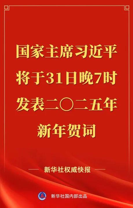 國家主席習近平將于31日晚7時通過中央廣播電視總臺和互聯網,發表二〇二五年新年賀詞。中央廣播電視總臺所屬中央電視臺綜合頻道、新聞頻道、中文國際頻道、4K頻道,中國國際電視臺各外語頻道,中央人民廣播電臺,中國國際廣播電臺,以及人民網、新華網、央視新聞客戶端等中央主要新聞媒體所屬網站、新媒體平臺將準時播出。