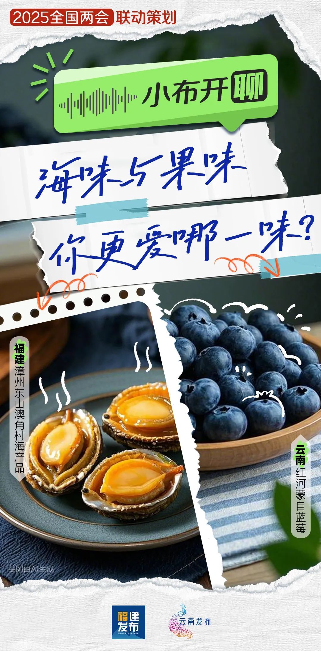 還記得去年 福建和云南的“花花聯動”嗎? 2025年全國兩會召開之際 小福再次撥通了“彩云之南”的“電話” 這次我們又能碰撞出什么樣的火花呢? 當海味遇上果味 你會pick誰呢? 今天 福建發布和云南發布這對“網友” 要給大家分享兩個超棒的地方 一個是福建漳州東山澳角村 那里海鮮肥美多汁 電商旅游齊開花 另一個是云南紅河蒙自草壩鎮 這里藍莓又大又甜 出口全國第一 還有超厲害的致富“密碼” 快來一探究竟吧! 小福提醒 點擊播放音頻 有驚喜哦 ?????? 鄉村振興是每年全國兩會以及中央一號文件聚焦的重點話題。2025年的中央一號文件強調鄉村產業發展的關鍵詞之一就是“縣域”。 做大做強縣域經濟,福建省各縣域注重產業差異化、特色化發展,形成晉江的鞋服、安溪的鐵觀音、柘榮的刀剪等一批縣域產業“金名片”。 云南著力推進以縣城為重要載體的城鎮化建設,全力打造健康、美麗、文明、智慧、幸福縣城,縣域經濟實力不斷壯大,城市承載力和綜合競爭力持續增強。 故事還在繼續 未來必將可期 讓我們一起期待 福建和云南在縣域產業發展上 能有更多合作 結出更多碩果 |