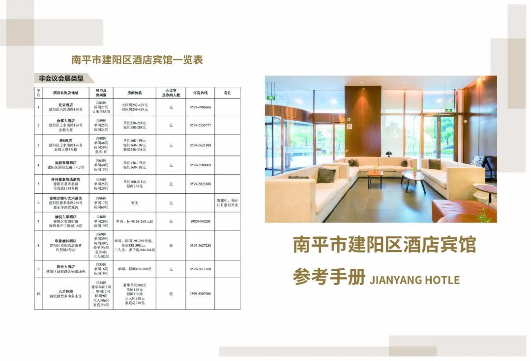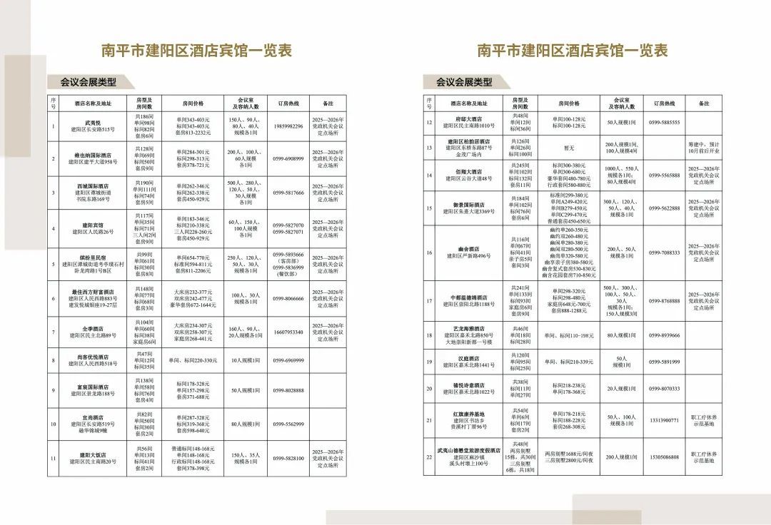 為積極響應南平市“迎賓客引人流”活動部署,建陽區以提升旅游服務品質為抓手,精心編制《南平市建陽區酒店賓館參考手冊》,現正式面向社會發布,為廣大游客及商務人士提供精準的住宿、辦會指引服務。 本手冊聚焦區內酒店資源,以是否具備會議會展功能對酒店進行系統分類,詳實列出房型配置、會議場地規模、價格區間等方面內容,既滿足游客多元住宿需求,也為商務活動提供專業參考。 建陽坐擁“國家公園南大門、崇陽溪百里畫廊、麻陽溪千載文脈”的獨特山水人文底蘊,正以開放姿態廣納四方賓客。我們熱忱歡迎各界人士來到建陽,感受建陽獨特的人文溫度和優質的住宿、辦會體驗,共赴一場“放心、安心、舒心”的建陽之旅。 |