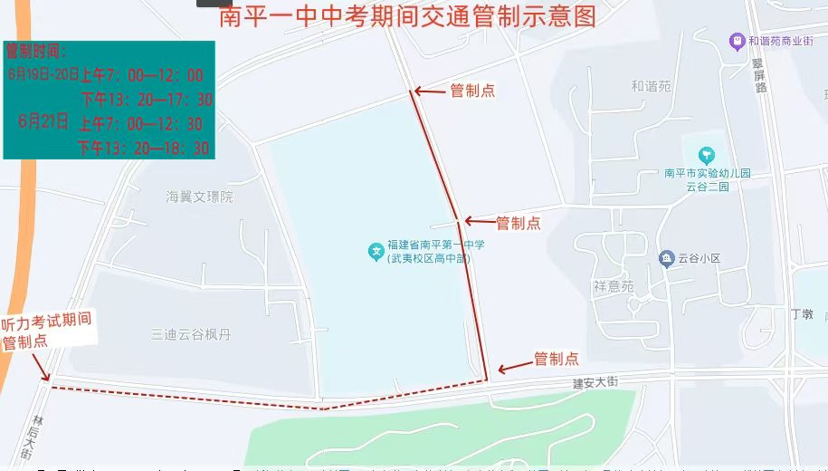 市民朋友們: 為確保2025年我區中考平安順利,為考生提供良好的考試環境,南平市建陽區招生委員會和南平市公安局交通警察支隊建陽大隊特向我區廣大市民朋友們作如下溫馨提示,請廣大市民予以配合支持。 一、2025年中考將于6月19—21日在建陽一中、建陽二中、南平一中武夷校區高中部進行。請廣大市民自覺維護好考點周邊環境,考試期間周邊住宅區居民請勿大聲喧嘩,電視與音響不得大聲播放,考點周邊車輛禁止鳴喇叭,禁止燃放煙花爆竹等。 二、部分區域將實行交通管制。 1.建陽一中、建陽二中、南平一中武夷校區高中部考點周邊將實行交通管制。 (1)建陽一中考點交通管制路段:西橋南路(水西橋南端至人民保險公司)、新建路(農業局門口至西橋南路三叉路口),考試期間禁止車輛通行。西橋西路(住建局門口至建陽一中北門口)、上水南路(水西橋南側至文化館),外語聽力考試期間禁止機動車通行。 (2)建陽二中考點交通管制路段:崇陽南路(水東橋頭至昌盛路口),外語聽力考試期間禁止車輛通行,其余考試期間禁止大型車輛通行。 (3)南平一中武夷校區高中部考點交通管制路段:立德路(府后街路口至建安大街路口),外語聽力考試期間增加建安大街(立德路口至林后大街路口)。 2.交通管制時間: 1、6月19—20日上午7:00—12:00,下午13:20—17:30; (20日下午外語聽力考試時間14:40—15:20,期間禁止一切機動車輛通行) 2、6月21日上午7:00—12:30,下午13:20—18:30; 3.根據考務需要和考點周邊交通流量情況,采取臨時交通管制措施,請避開考點管制路段,服從現場交警指揮。 4.為保證考點周邊交通秩序井然,防止人群聚集造成交通擁堵,今年送考生到建陽一中、建陽二中考點、南平一中武夷校區高中部考點的家長或親友均不得進入交通管制線內,接送考生車輛即停即走,請考生家長和親友予以配合支持。 建陽交警溫馨提示:建陽交警在考點及附近路段部署了警力和警車,巡邏防范、疏導交通、為丟失或未帶證件等遭遇緊急情況的考生提供應急服務,考生如遇緊急情況,請第一時間聯系就近的執勤交警,我們將給予幫助。 附:考試期間交通管制示意圖 南平市建陽區招生委員會 南平市公安局交通警察支隊建陽大隊 2025年6月13日 |