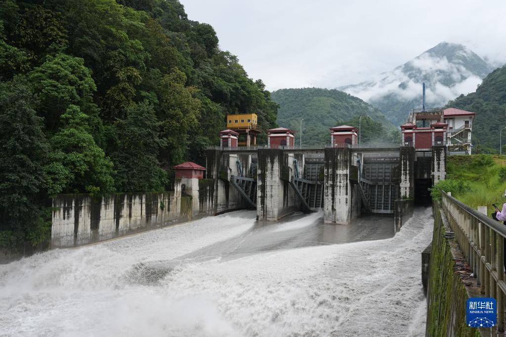 這是8月8日在尼泊爾勒姆宗縣拍攝的上馬相迪A水電站大壩。