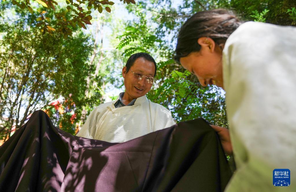 洛桑麥朗(左)在學校和學徒一起查驗成品藏裝品質(8月15日攝)。 在拉薩雪堆白傳統手工藝術學校,60歲的西藏自治區級非物質文化遺產項目藏族服飾(拉薩服飾)代表性傳承人洛桑麥朗,與學徒一道研究、制作藏裝。從藝四十余載,他培養了百余名弟子,還參與編撰教材、建立藏族服飾數據庫等工作。在他的巧手下,新式藏裝將傳統與現代交融,讓非遺技藝與現代審美碰撞,成為街頭一道靚麗的風景。 新華社記者 晉美多吉 攝 洛桑麥朗手繪的藏裝制作要領(8月15日攝)。 在拉薩雪堆白傳統手工藝術學校,60歲的西藏自治區級非物質文化遺產項目藏族服飾(拉薩服飾)代表性傳承人洛桑麥朗,與學徒一道研究、制作藏裝。從藝四十余載,他培養了百余名弟子,還參與編撰教材、建立藏族服飾數據庫等工作。在他的巧手下,新式藏裝將傳統與現代交融,讓非遺技藝與現代審美碰撞,成為街頭一道靚麗的風景。 新華社記者 晉美多吉 攝 洛桑麥朗(右)在學校指導學徒裁剪布料(8月15日攝)。 在拉薩雪堆白傳統手工藝術學校,60歲的西藏自治區級非物質文化遺產項目藏族服飾(拉薩服飾)代表性傳承人洛桑麥朗,與學徒一道研究、制作藏裝。從藝四十余載,他培養了百余名弟子,還參與編撰教材、建立藏族服飾數據庫等工作。在他的巧手下,新式藏裝將傳統與現代交融,讓非遺技藝與現代審美碰撞,成為街頭一道靚麗的風景。 新華社記者 晉美多吉 攝 洛桑麥朗(左)在學校指導學徒(8月15日攝)。 在拉薩雪堆白傳統手工藝術學校,60歲的西藏自治區級非物質文化遺產項目藏族服飾(拉薩服飾)代表性傳承人洛桑麥朗,與學徒一道研究、制作藏裝。從藝四十余載,他培養了百余名弟子,還參與編撰教材、建立藏族服飾數據庫等工作。在他的巧手下,新式藏裝將傳統與現代交融,讓非遺技藝與現代審美碰撞,成為街頭一道靚麗的風景。 新華社記者 晉美多吉 攝 洛桑麥朗在檢查做好的藏裝(8月15日攝)。 在拉薩雪堆白傳統手工藝術學校,60歲的西藏自治區級非物質文化遺產項目藏族服飾(拉薩服飾)代表性傳承人洛桑麥朗,與學徒一道研究、制作藏裝。從藝四十余載,他培養了百余名弟子,還參與編撰教材、建立藏族服飾數據庫等工作。在他的巧手下,新式藏裝將傳統與現代交融,讓非遺技藝與現代審美碰撞,成為街頭一道靚麗的風景。 新華社記者 晉美多吉 攝 洛桑麥朗(左)來到畢業生創業的店鋪里,詢問生意情況(8月15日攝)。 在拉薩雪堆白傳統手工藝術學校,60歲的西藏自治區級非物質文化遺產項目藏族服飾(拉薩服飾)代表性傳承人洛桑麥朗,與學徒一道研究、制作藏裝。從藝四十余載,他培養了百余名弟子,還參與編撰教材、建立藏族服飾數據庫等工作。在他的巧手下,新式藏裝將傳統與現代交融,讓非遺技藝與現代審美碰撞,成為街頭一道靚麗的風景。 新華社記者 晉美多吉 攝 模特在拉薩八廓街“繁飾自然·衣彩拉薩——拉薩新年服飾秀”活動中巡游(1月3日攝)。 在拉薩雪堆白傳統手工藝術學校,60歲的西藏自治區級非物質文化遺產項目藏族服飾(拉薩服飾)代表性傳承人洛桑麥朗,與學徒一道研究、制作藏裝。從藝四十余載,他培養了百余名弟子,還參與編撰教材、建立藏族服飾數據庫等工作。在他的巧手下,新式藏裝將傳統與現代交融,讓非遺技藝與現代審美碰撞,成為街頭一道靚麗的風景。 新華社記者 晉美多吉 攝 |