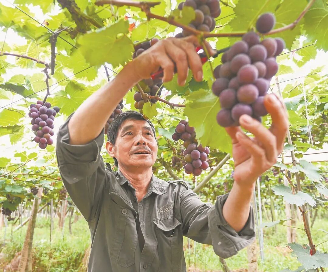 仁山村村民在采摘葡萄 近日,記者走進南平市建陽區水吉鎮仁山村,路兩旁的葡萄大棚連成一片。大棚內藤蔓交纏,綠葉間綴著一串串飽滿的紫紅葡萄。 “這串陽光玫瑰硬度剛好,耐運輸,可以摘下來裝箱了。”種植戶傅秋華踮腳夠上高處的葡萄,左手虛攏果串,右手的剪刀“咔嚓”一聲鉸斷果柄,而后輕輕放入筐中。他和家人種了近10畝葡萄,“巨峰”“夏黑”“陽光玫瑰”等品種輪番成熟,一茬接一茬地忙。出了大棚,空地上裝滿葡萄的竹筐碼得整整齊齊,等著裝箱后發往全國各地。 不遠處,種植大戶何沛華的果園同樣忙碌。80畝葡萄已進入收獲季,十幾名村民忙著采摘、分揀、裝箱,流水線作業趕訂單。“一畝能收2000多斤葡萄,刨去成本,每畝能賺將近1萬元。”蹲在地上清點完剛摘的葡萄后,何沛華給記者算了一筆賬。 而今,仁山村已經成為閩北葡萄種植面積最大的村。據介紹,仁山村葡萄產業能成氣候,離不開謝福鑫這名“開路人”。2003年,作為福建省首批科技特派員之一,他考察仁山村時發現這里地勢平、土壤肥、光照足、水質好,特別適合種葡萄,便引導村里黨員干部帶頭試種74畝巨峰葡萄,次年便迎來豐收,每畝收入超4000元。從此,越來越多的村民跟著種起了葡萄。“仁山葡萄”的名氣漸漸傳開——2017年亮相廈門金磚會晤,2019年又掛上“武夷山水”區域品牌。 仁山葡萄不愁賣,還多虧科特派帶動村里早謀劃。2006年,在謝福鑫科特派服務團隊的幫扶下,仁山村的種植戶聯合成立“建陽區山溪葡萄專業合作社”,統一技術指導、統一購進生產資料、統一時間噴藥管護、統一銷售鮮果、統一使用“仁山牌”商標。不光葡萄長得更好了,還解決了農資貴、銷售難等問題。 如今,仁山村的葡萄藤已爬向周邊3個鄉鎮17個行政村,形成3200余畝葡萄產業帶,年產鮮食葡萄近5000噸,年產值達3500多萬元,讓402戶農民的腰包鼓了起來。 “我們仁山村目前有1200多畝葡萄,85%的村民靠葡萄吃飯,年產值超過1300萬元。”仁山村黨支部書記、村委會主任林貽輝一邊領著記者在村里轉,一邊介紹,接下來,仁山村將依托“葡萄發展黨建聯合體”,推進仁山科特派示范基地建設,打造“十里山溪葡萄溝高品質黨建帶”。“往后游客來村里,可以摘葡萄、采橘柚,還能賞建盞、品好茶,大伙的日子一定更甜。”(王玥明 陳穎 張行健) |